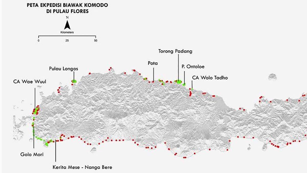 Terdapat 85 titik lokasi kamera menangkap kehadiran komodo di pesisir utara, barat, dan selatan Pulau Flores serta Pulau Longos. Ada 9 lokasi yang masih ditemukan keberadaan komodo yakni di Golo Mori, Cagar Alam Wae Wuul dan Pulau Longos di Kabupaten Manggarai Barat. Pota dan Gololijun di Kabupaten Manggarai Timur, serta Torong Padang, Cagar Alam Riung, Cagar Alam Wolo Tadho dan Pulau Ontoloe di TWAL 17 Pulau di Kabupaten Ngada.