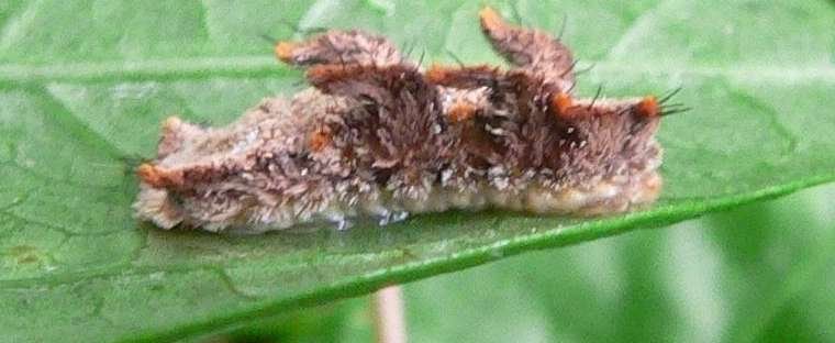 Ulat ini dijuluki “siput monyet ” karena bentuknya yang memang aneh. Tubuhnya sepenuhnya ditutupi rambut coklat yang pendek, badannya melebar dan sebagian bulu2nya memanjang di kedua sisinya, mirip kaki dan bahkan terlihat seperti bintang laut.