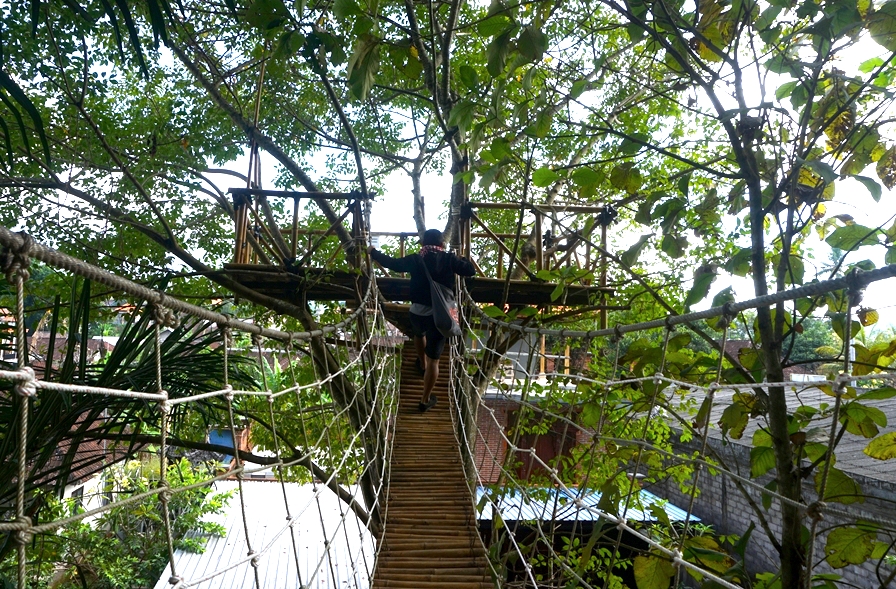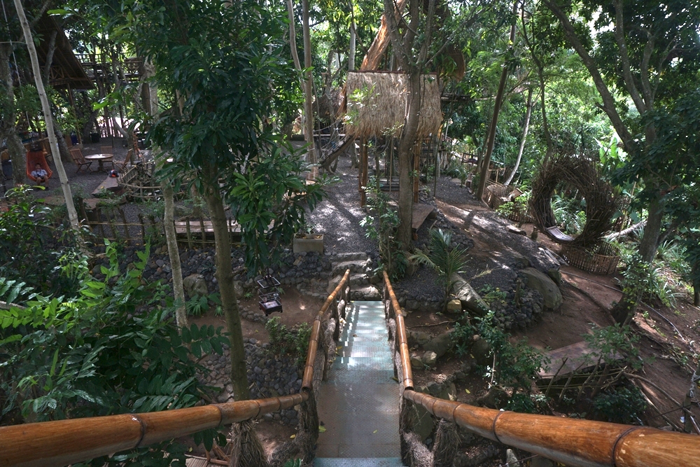 Pengunjung lebih terkonsentrasi di bawah, duduk santai atau main ayunan. Menikmati kerindangan pohon dengan tiket masuk Rp15 ribu ini. Pepohonan yang menjadi landasan berusia puluhan tahun jenis beringin seperti kepuh dan bunut. Lainnya, pohon-pohon mangga tua yang sudah tak banyak berbuah.