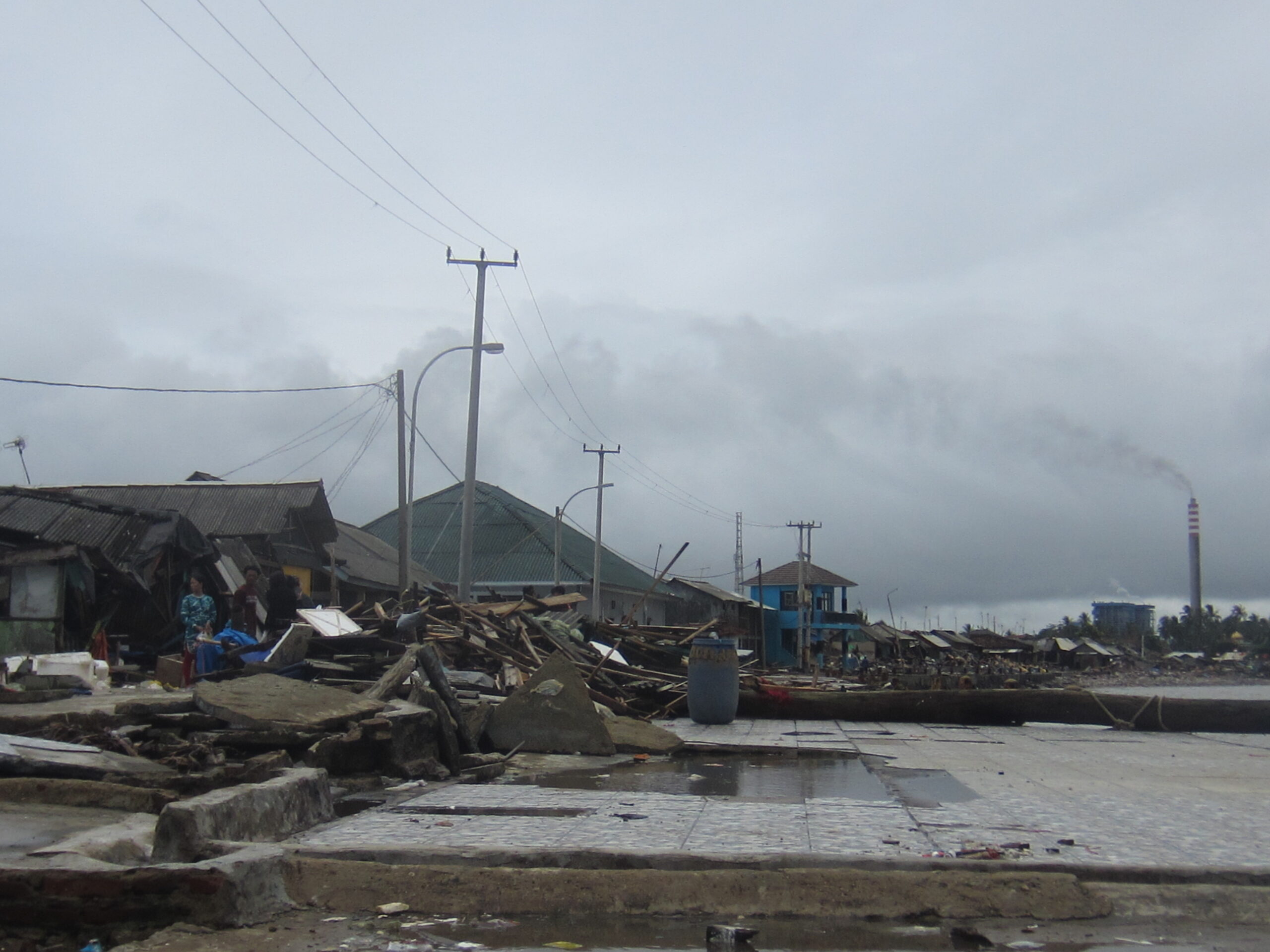 Teras dermaga hancur. Berlubang sana sini. PPI tutup. Beberapa penduduk dan nelayan tak sedang menyetor ikan atau membuat ikan asin, seperti biasa. Mereka membongkar puing-puing rumah. Mencari barangkali ada benda berharga masih bisa diselamatkan. Rumah-rumah nelayan, pasar, yang memadati bibir pantai, hancur berantakan. Tak satupun utuh.