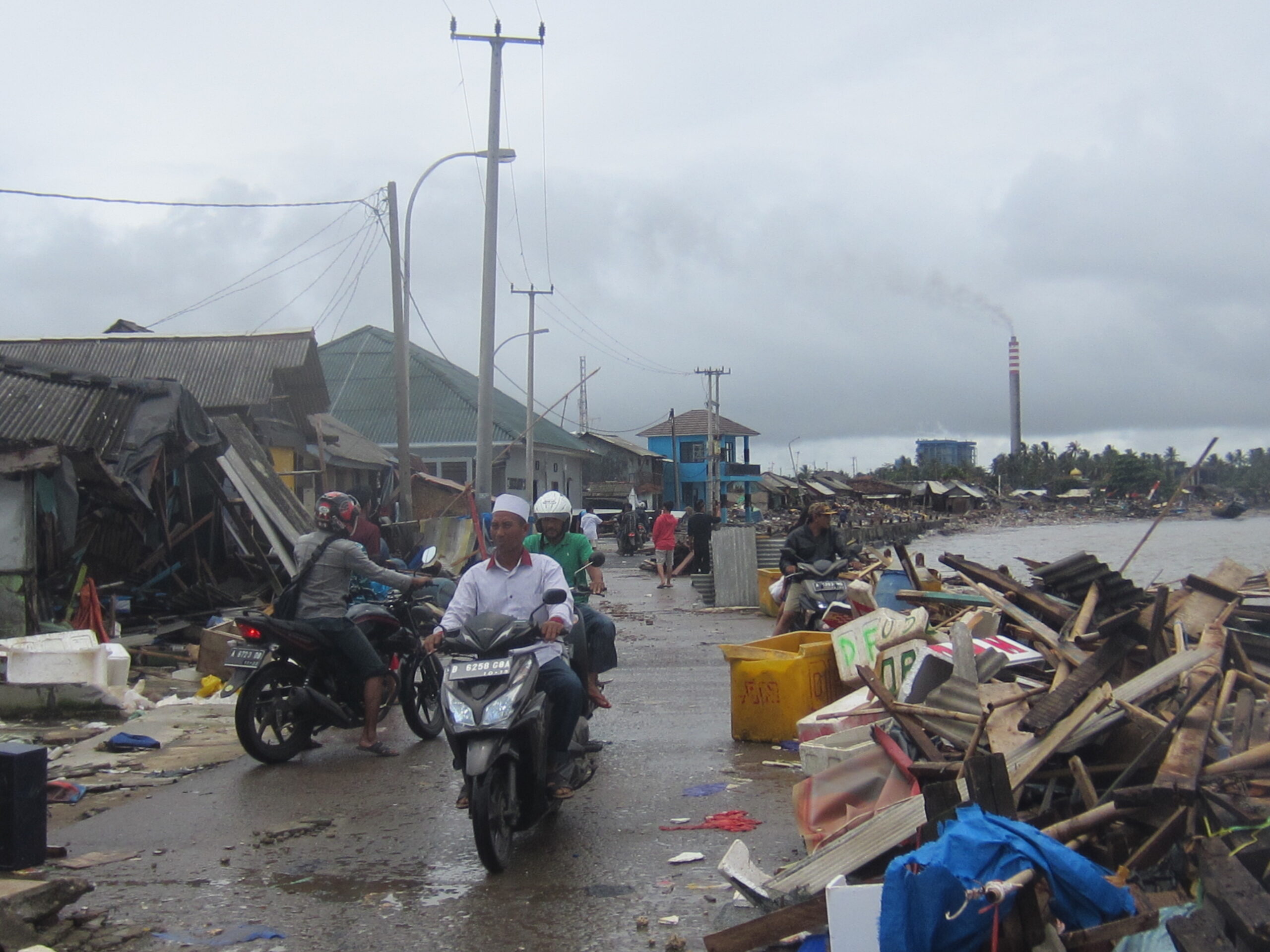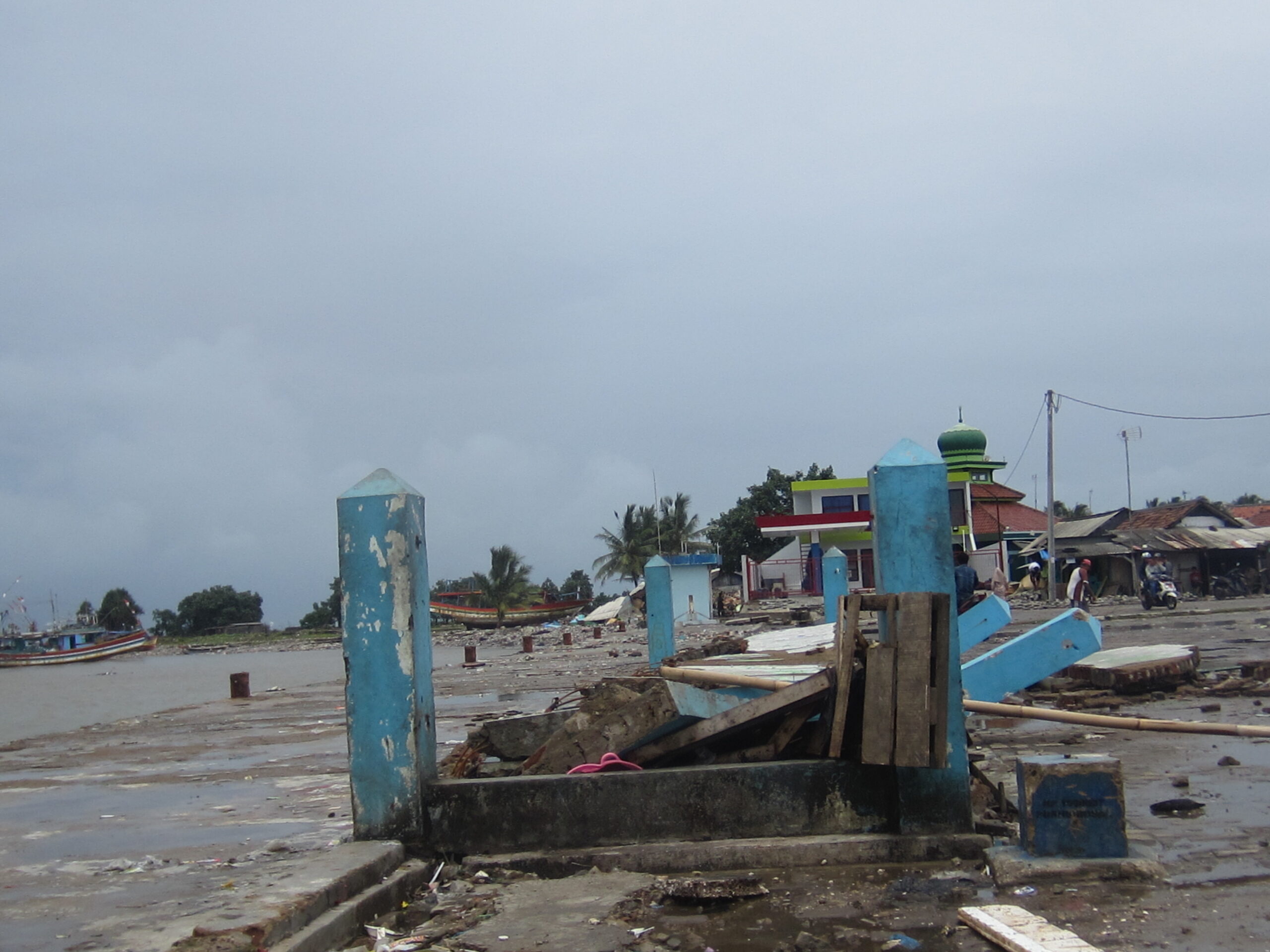 Desa Teluk di bibir Pantai Labuan, Pandeglang, Banten, hari ketiga pasca tsunami. Saya menginjakkan kaki di lapangan cukup luas di depan Kantor Syahbandar Desa Teluk, Banten. Bangunan cat biru tua itu masih berdiri. Saya pernah ke sini Agustus 2017.