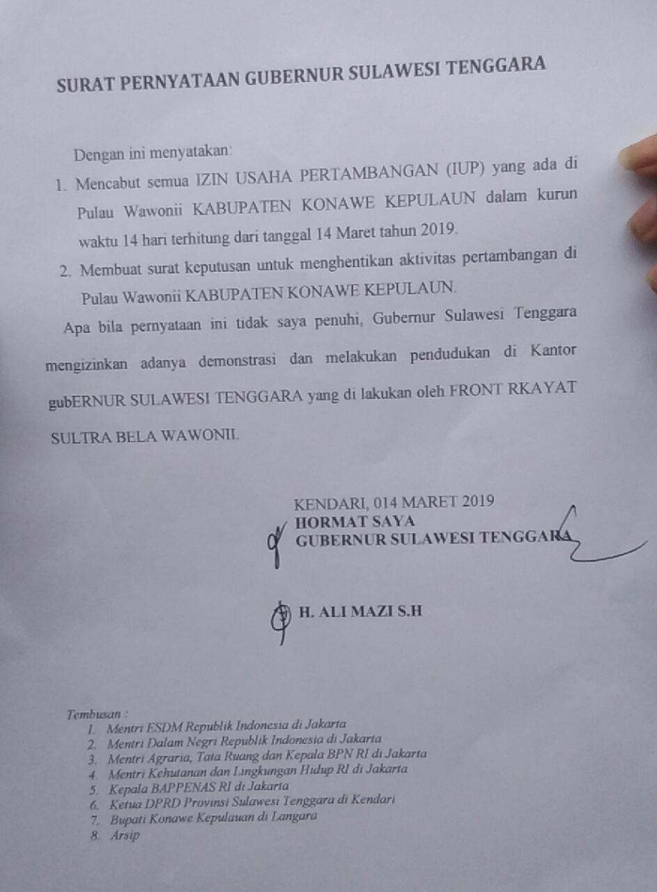 Pada Kamis (14/3/19), dalam pertemuan dengan warga dan mahasiswa Wawonii, sekitar 1.500 orang di Kantor Gubernur, Lukman Abunawas, Wakil Gubernur Sultra, menandatangani surat pernyataan pencabutan 15 IUP di Wawonii.