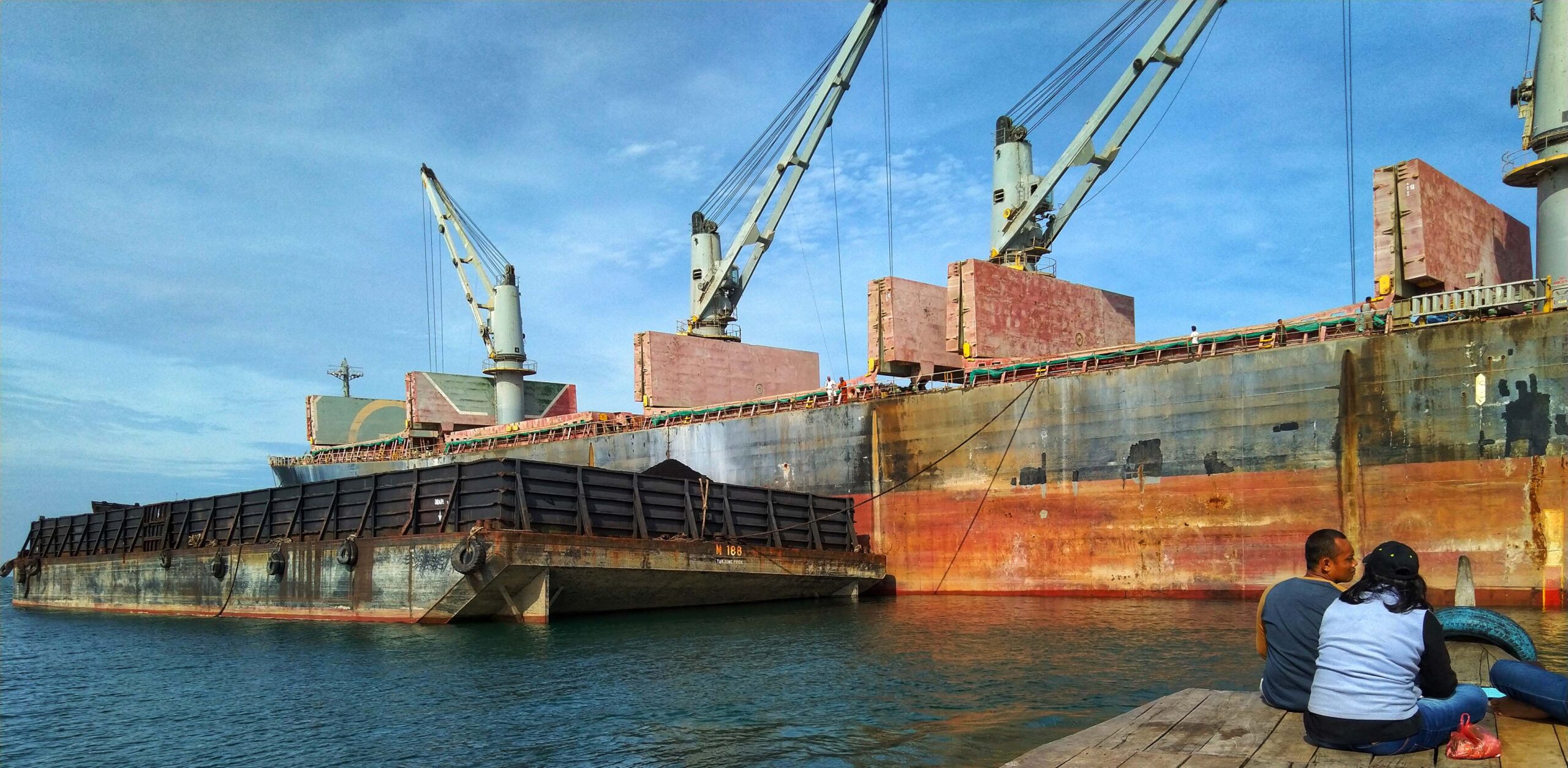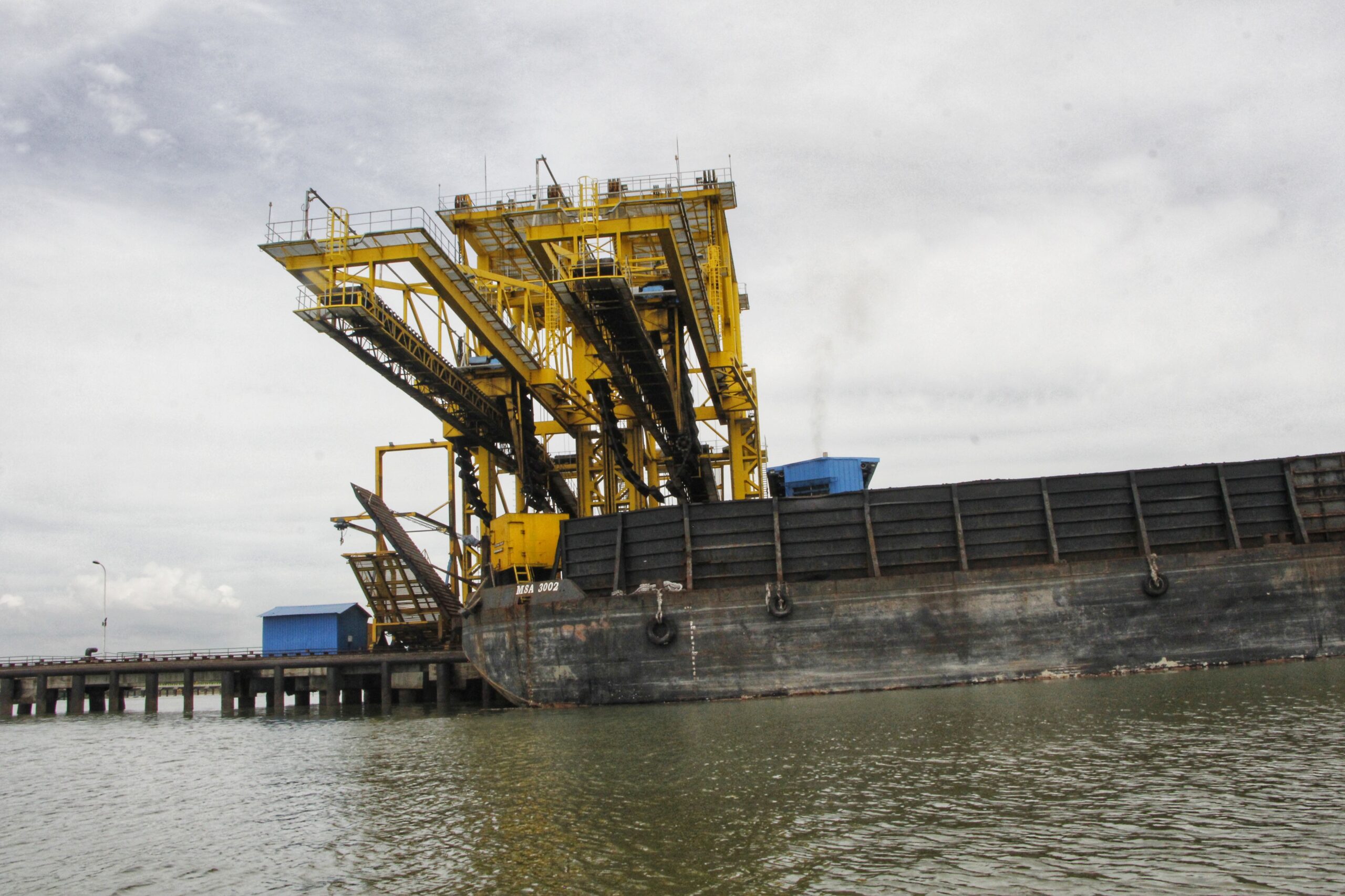 Tampak dari kejauhan, beberapa kapal pengangkut batubara tengah memindahkan hasil tambang ke tongkang. Air laut sekitar tak biru lagi, tetapi terlihat kehitanan. Dulu, laut Selat Malaka ini biru dengan lumba lumba acapkali terlihat. Pemandangan ini sudah hal langka.