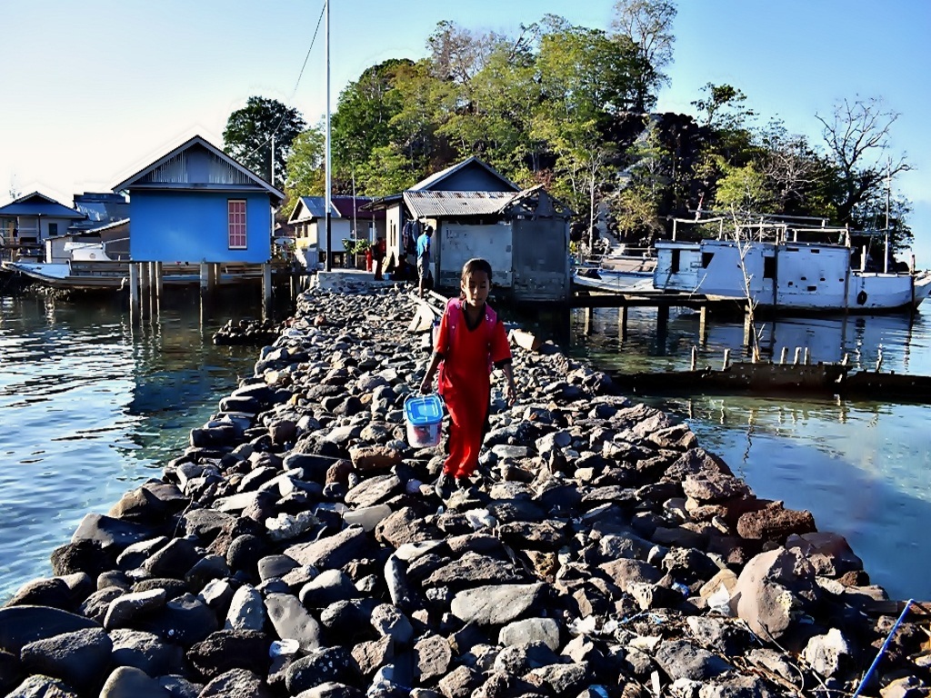 Kubah masjid berwarna emas dan deretan rumah warga terlihat jelas. Sejauh mata memandang, tampak air laut berwana hijau dan kebiruan. Beberapa sampan dan perahu nelayan terlihat hilir mudik menangkap ikan.