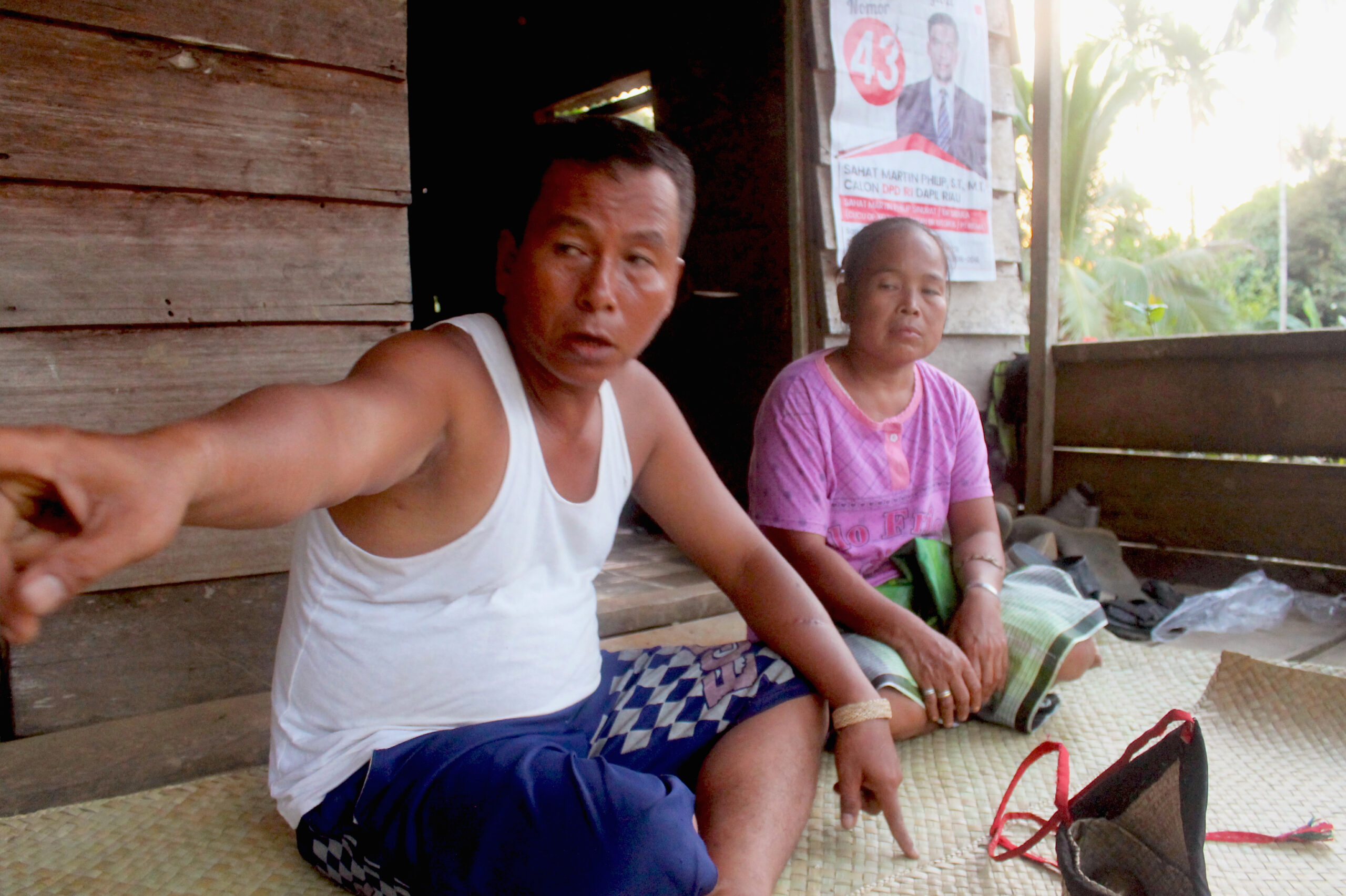 “Kami kehilangan hutan, artinya kehilangan identitas. Rumbai, pandan yang kami gunakan untuk menganyam ini dari hutan. Sekarang sulit didapat.”