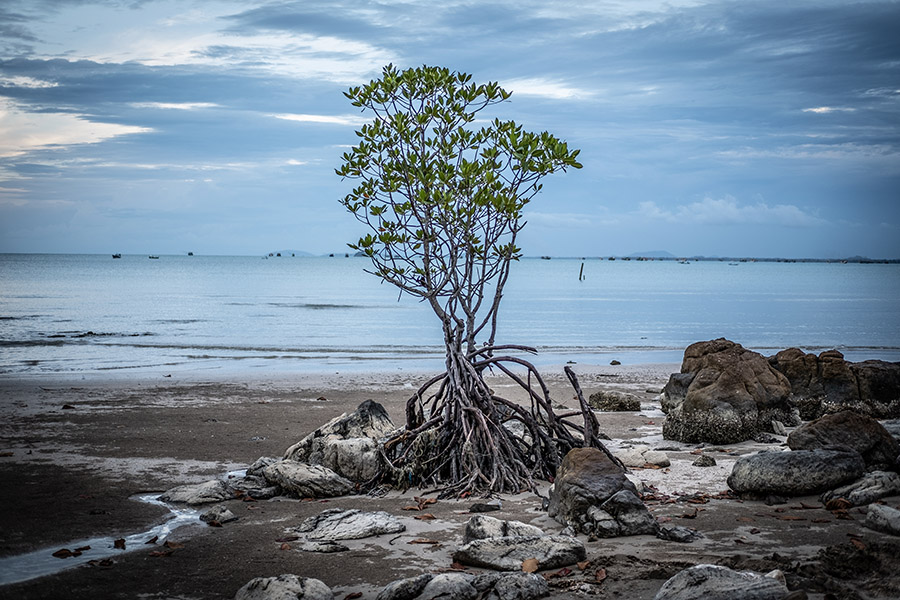 Daunnya terlihat hijau, sementara sebagian akarnya mencengkram pasir pantai yang dipenuhi sampah. Ini gambaran sebatang pohon bakau [Rhizopora spp.] di sekitar pesisir Tuing, utara Pulau Bangka, Provinsi Kepulauan Bangka Belitung.