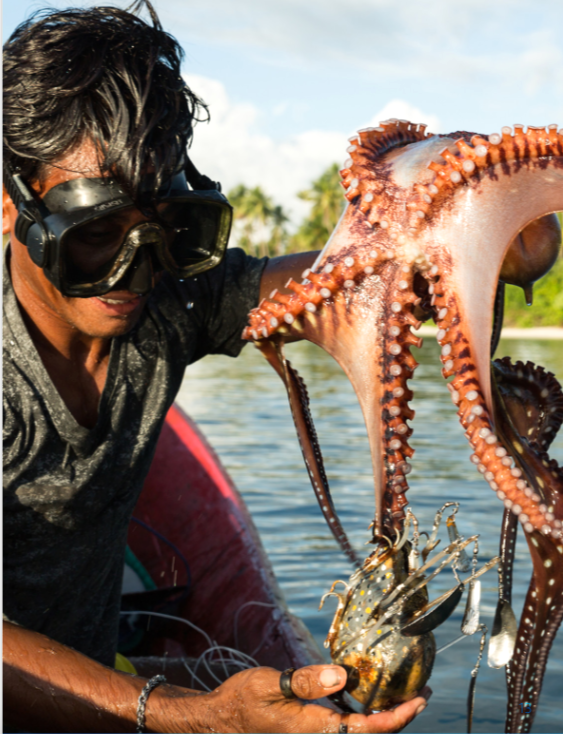 Menurut Andre Mustain, gurita merupakan target perikanan masyarakat Desa Kahu-kahu yang mempunyai nilai jual relatif tinggi namun mengalami keterancaman karena penangkapan berlebihan dan tak memperhatikan ukuran.