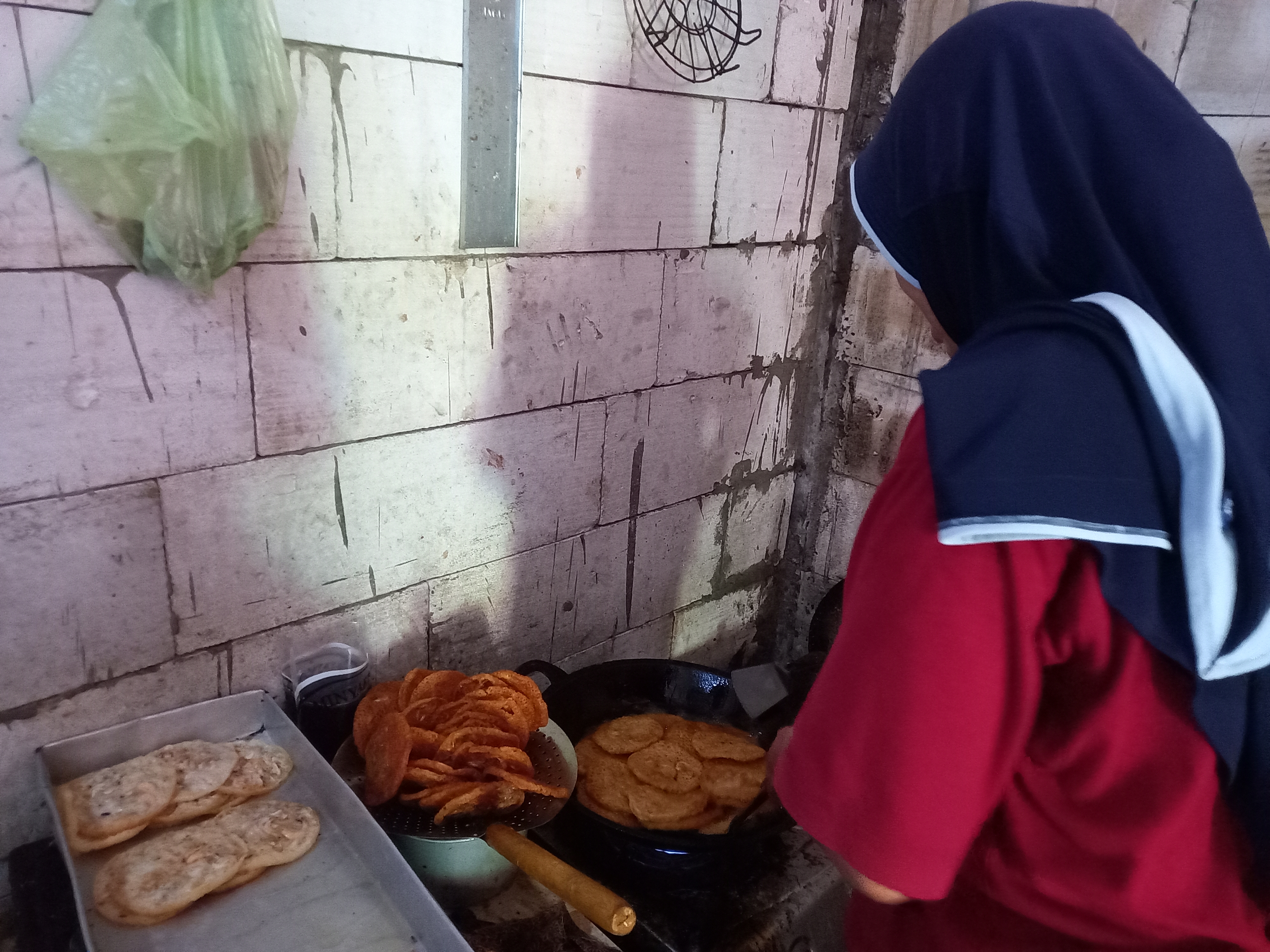 “Pemerintah hanya meninggikan jalan, tidak ada solusi konkret,” kata Hidayah, sambil membalikkan adonan rempeyek.