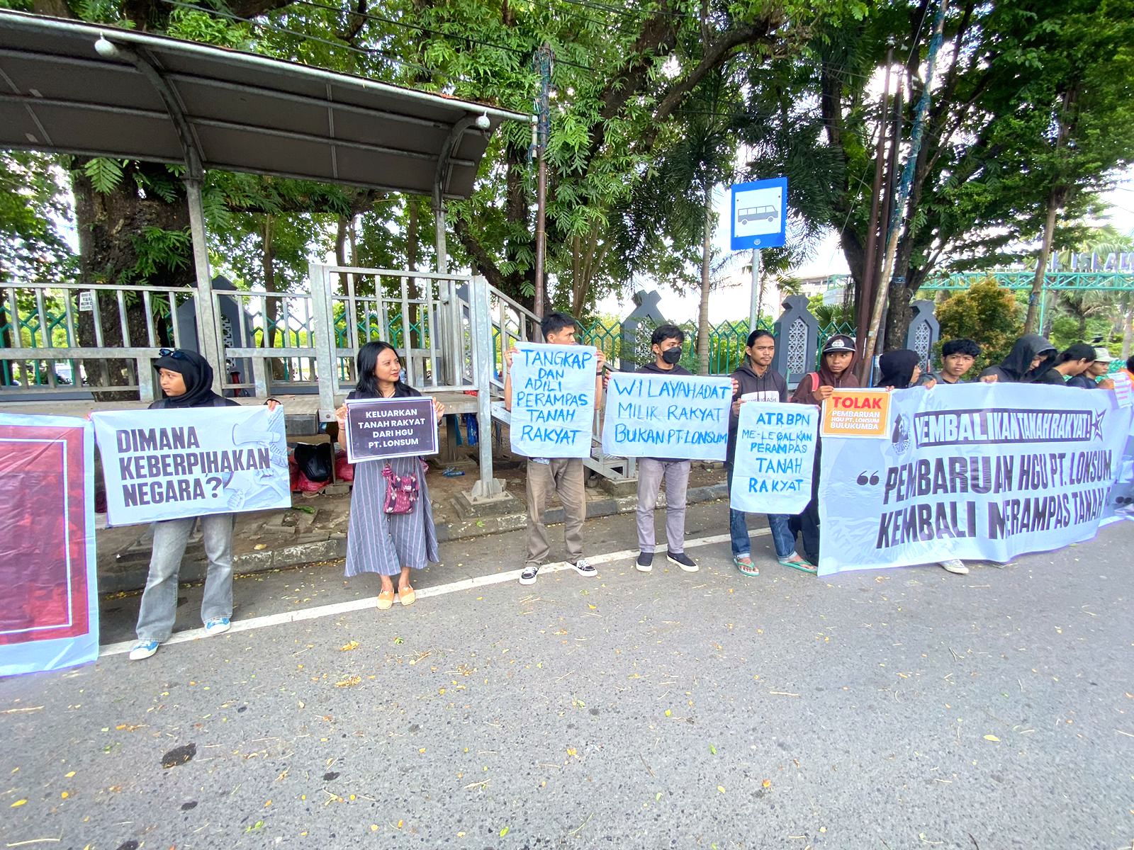 Abdul Azis Dumpa, Wakil Direktur Yayasan Lembaga Bantuan Hukum Indonesia (YLBH)-Lembaga Bantuan Hukum (LBH) Makassar, yang bertindak sebagai juru bicara warga dan GRAMT, menyampaikan tuntutan masyarakat dalam proses pembaruan HGU Lonsum.