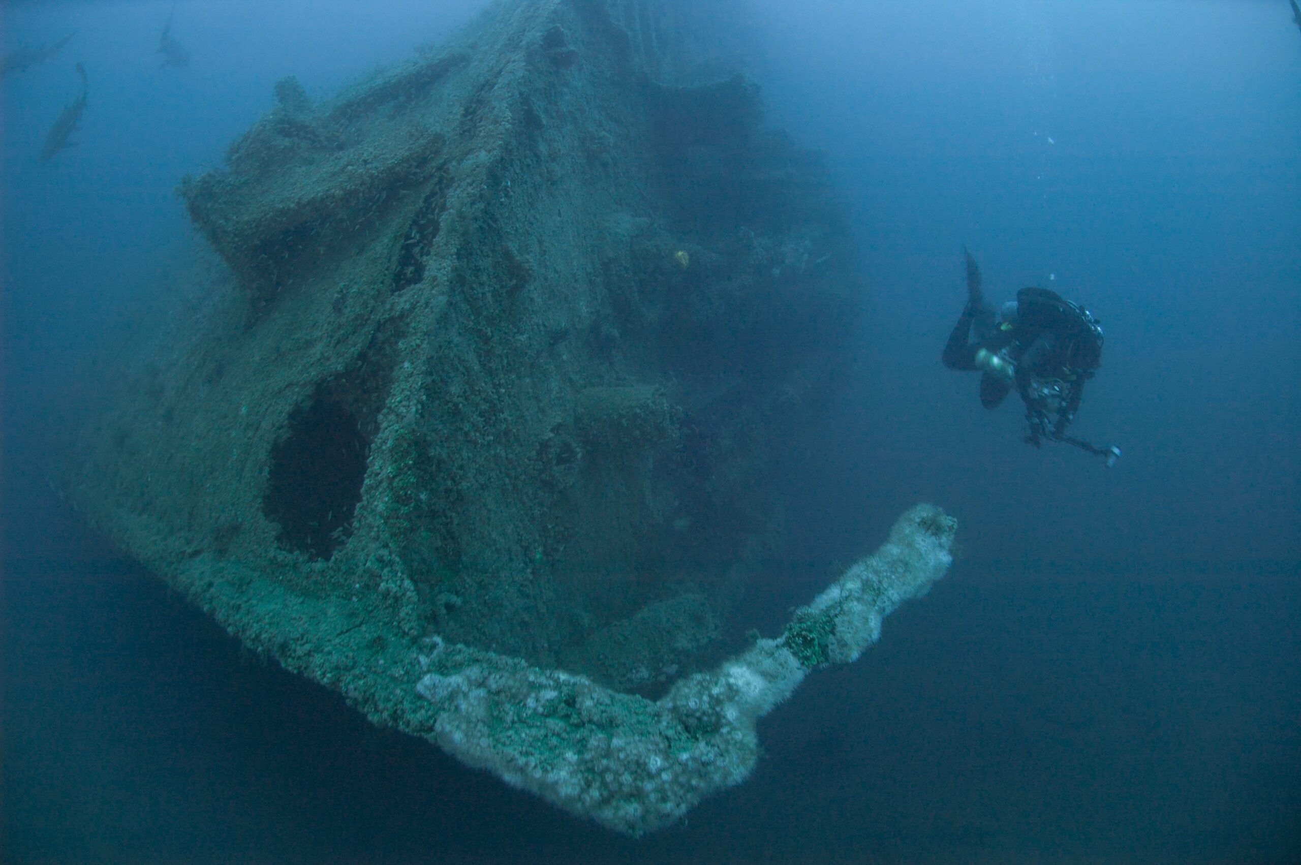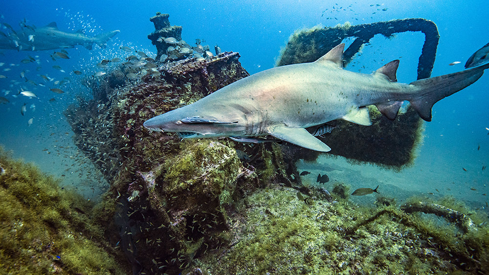 Karang dan spons berwarna cerah menghiasi permukaan bangkai kapal, sementara kawanan ikan kecil berkilauan di sekitarnya, dikejar predator yang ramping dan cepat. Hiu sering terlihat berkeliling, mungkin untuk beristirahat atau mencari mangsa.