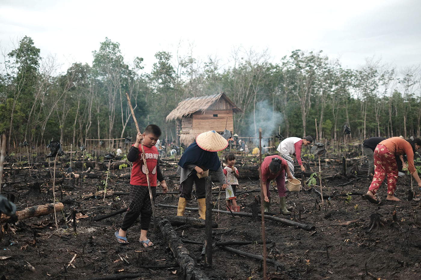 “Kami menanam padi sekitar tiga tahun di ladang ini, sebelum pohon karet besar. Hasil padinya bukan dijual, tapi untuk kebutuhan pangan, termasuk berbagi dengan keluarga atau tetangga yang turut membantu nugal,” kata Asrina.